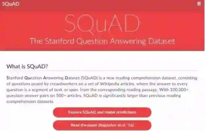 SQuAD的全称是斯坦福问答数据集(Stanford Question Answering Dataset),是由斯坦福大学自然语言处理实验室开发的数据集和比赛。SQuAD的数据来自Wikipedia的文章。数据标注人员去掉了文章里的一些单词,并让参赛队伍利用模型重新填空,借以检测模型对文章的理解程度