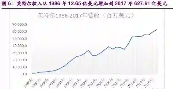 到1972年,英特尔已经有超过1000名雇员,销售额达到2300万美元。1974年,英特尔有近3100名员工,销售额为1.4亿美元。到1984年,英特尔销售额达到16亿美元,在《财富》500强中上升至226名。在此后1986年至2017年期间,英特尔的营业收入从1986年的12.65亿美元增加到2017年的627.61亿美元,年均复合增长率(GAGR)为13.4%,复合增速相当高。