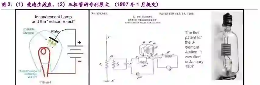 1904年,弗莱明利用爱迪生效应研制出第一个二极管(Diode),并获得了专利,这个二极管可以用来做无线电电报的检波器。1906年,德·福雷斯特在二极管的灯丝之间巧妙加了一个栅板,发明了第一个真空电子三极管,用于检波放大。1912年,美国通用电气公司和美国电话电报公司合作研制出了高真空电子三极管,使得三极管的放大倍数大幅提高,工作性能更加稳定,从而电子管进入了实用阶段,进而衍生出了广播、电视、计算机等行业,是今天电子产品的奠基石。