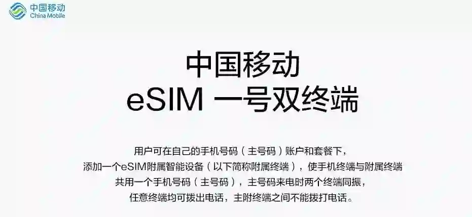 而该服务具体能实现什么目的,根据移动官方的介绍我们可以看到,用户可在自己的手机号码(主号码)账户和套餐下,添加一个eSIM辅助智能设备,使手机终端与附属终端共用一个手机号码(主号码),主号码来电时两个终端同振,任意终端均可拨出电话,主附终端之间不能拨打电话。