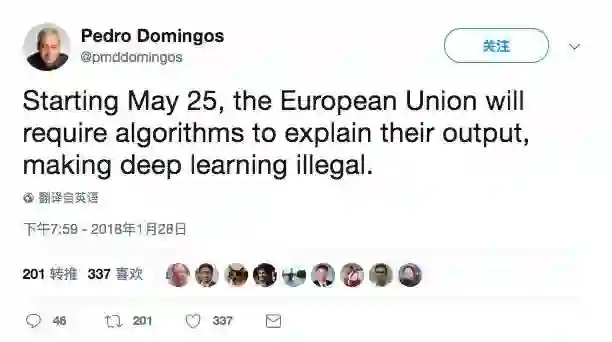 “从 25 日起,欧盟将要求算法解释输出的原理,届时深度学习将变得非法。”