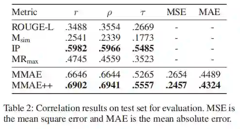 目前多模态自动文摘的数据集还比较匮乏,这项工作在MSMO数据集上进行实验验证。一般图文式摘要的评价关注三个方面的指标:图片准确率(IP)、文本摘要的ROUGE值(ROUGE-L)以及系统输出中图片文本的相关度(Msim)。该论文引入一个新的自动评价指标MRmax用来直接度量两个多模态信息之间的相似度(输出和参考答案的最大相似度)。MMAE是对IP、ROUGE和Msim的组合,MMAE++是IP、ROUGE、Msim和MRmax四个自动评价指标的组合。利用与人工打分之间的相关度来对比不同的自动评价指标。