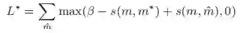 在跨模式检索中,输入是一对图像和一个文本。但是在该论文提出的模型中,输入变成一对多模态分段(ma,mb),其中ma =(Imagea,Texta)和mb =(Imageb,Textb)。关键问题是如何构建训练数据。MSMO数据集中有很多图像字幕对,并且假定每个图像都与相应的字幕相匹配。因此,通过交换两个图像标题对的图像(或文本)以获得匹配的多模态分段对(ma*,m*b),其中m*a =(Imageb,Texta)和m*b =(Imagea ,Textb)。值得注意的是,由于m*b中的Imagea与m*a中的Texta相匹配,而m*a中的Imageb与m*b中的Textb相匹配,因此m*a在语义上与m*b相匹配对图像和文本进行编码,然后使用多模式注意力机制融合文本向量和图像特征。最后模型是在一个新的最大利润率损失下训练的: