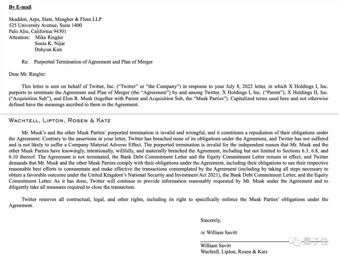 紧接着在当地时间7月10日,推特聘请Wachtell, Lipton, Rosen & Katz LLP律师事务所应对马斯克,就见诸报端,并且从推特给提交给SEC的律师函来看,也是在当天就拟定好的。