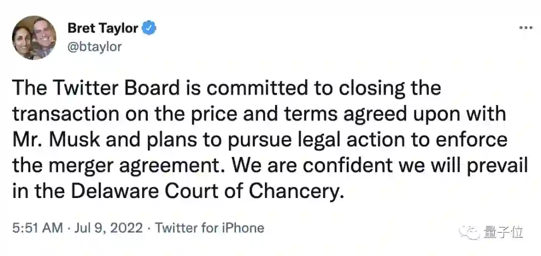不久之后,当地时间7月9日早上不到6点,推特董事长就发推回应:咱们法庭见。