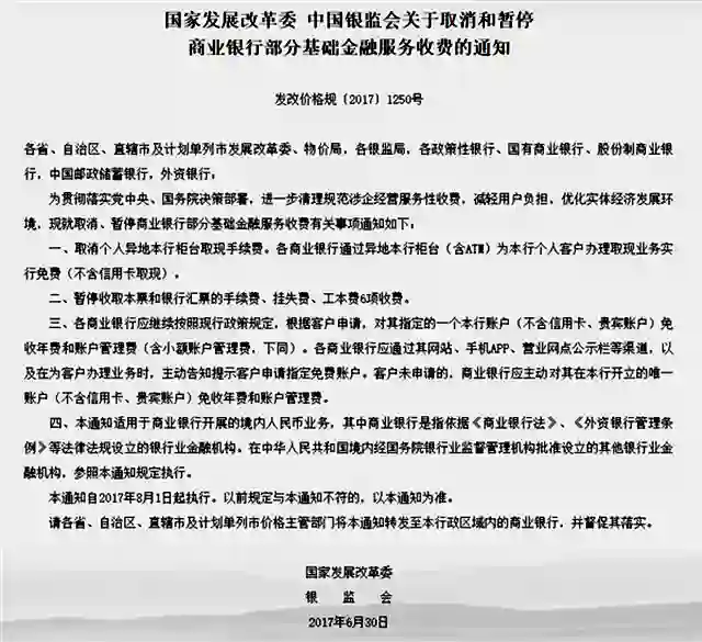 根据 6 月 30 日发改委和银监会下发的《国家发展改革委中国银监会关于取消和暂停商业银行部分基础金融服务收费的通知》,自 2017 年 8 月 1 日起,取消个人异地本行柜台取现手续费,暂停收取本票、汇票的手续费、挂失费、工本费 6 项收费,各商业银行应主动对客户在本行开立的唯一账户免收账户管理费和年费等。