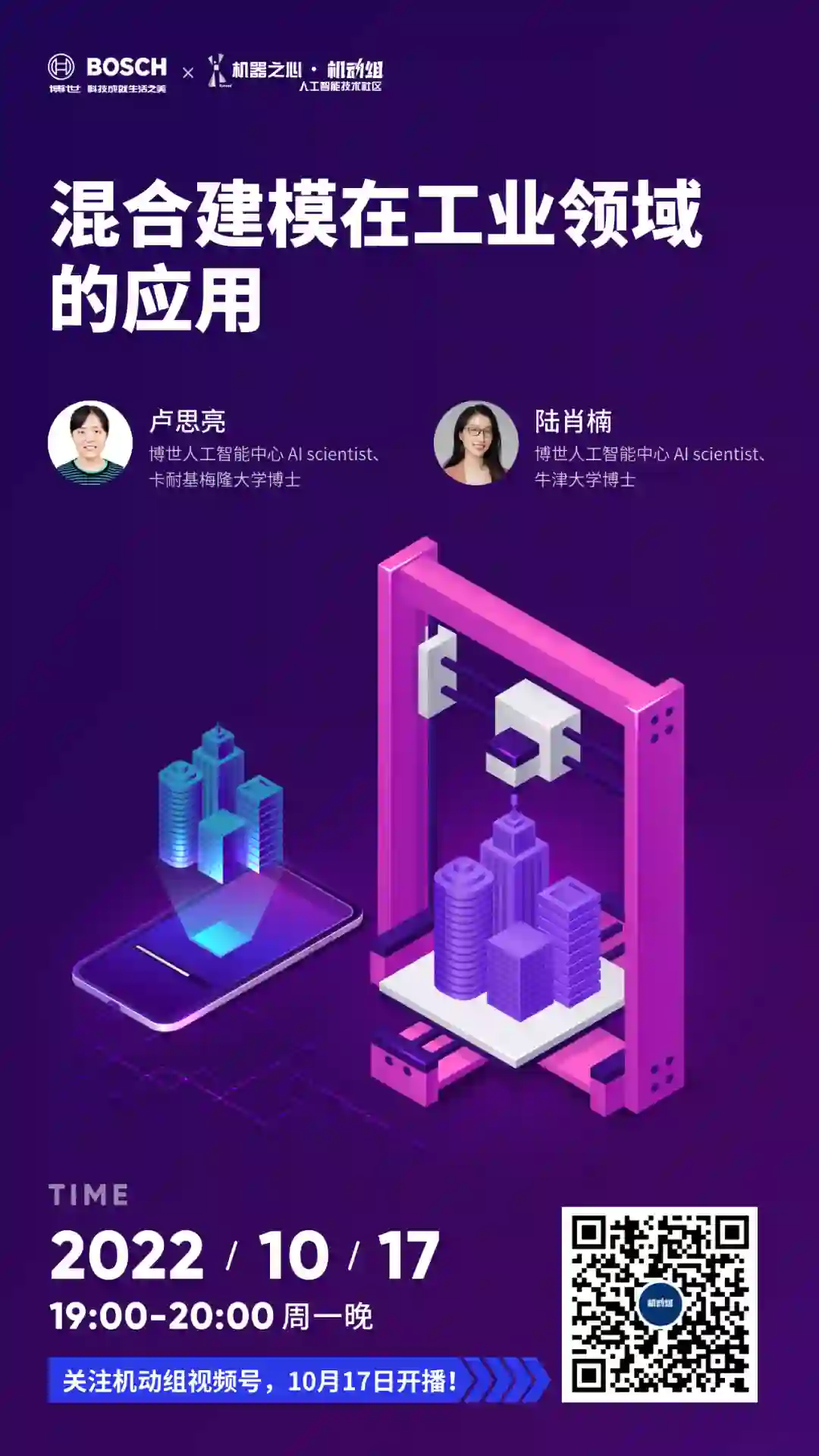 10月17日19:00-20:00,来自博世中国的卢思亮、陆肖楠两位专家将深入解读「混合建模在工业领域的应用」。这次分享着重于混合模型建模,一种结合机理模型和数据驱动模型的思路,帮助大家学习到混合建模的核心,为踏入工业界打好基础。