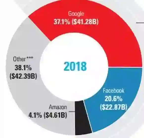 谷歌、Facebook、亚马逊这三家加起来已占据美国在线广告总市场份额的61.9%(以2018数据计算),从这个意义上说,美国在线广告市场是一个寡头市场。