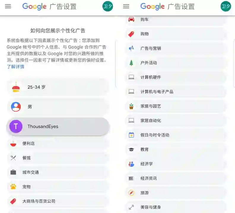 同时,谷歌也尽可能做到了数据透明,下图是我在YouTube看 广告的时候,谷歌在广告设置展示的我的标签。
