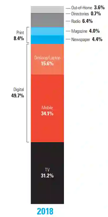 我们来看一下下面这张图,2018年在线广告占据的总体广告收入的49.7%。其中移动占比34.1%,PC占比15.6%。我相信在线市场占总份额不到一半,可能比大家想象中相比要相对低一些。