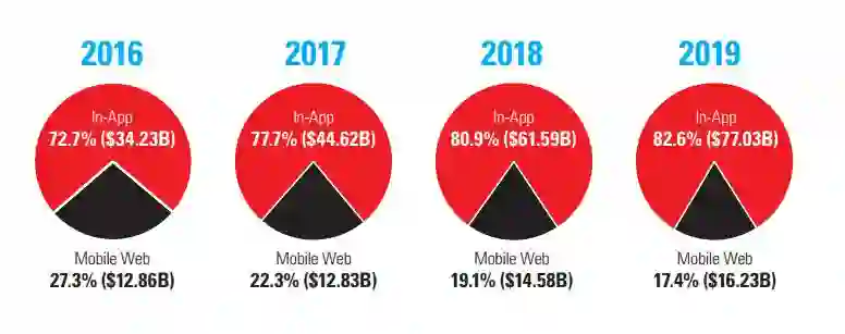 接下来看另一个重要趋势——在线广告在APP里市场份额和Web端相比在不断上升。这背后的原因是在目前的移动生态下,原生应用的确比移动浏览器能提供更好的用户体验。