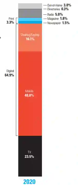 当然,我们不能只看现状,我们也应该看未来的趋势,电视归根结底是一个存量市场,而在线广告才是真正的星辰大海。我们看到2020年,在线广告的市场份额飙升到64.9%,电视的份额下降到23.5%。