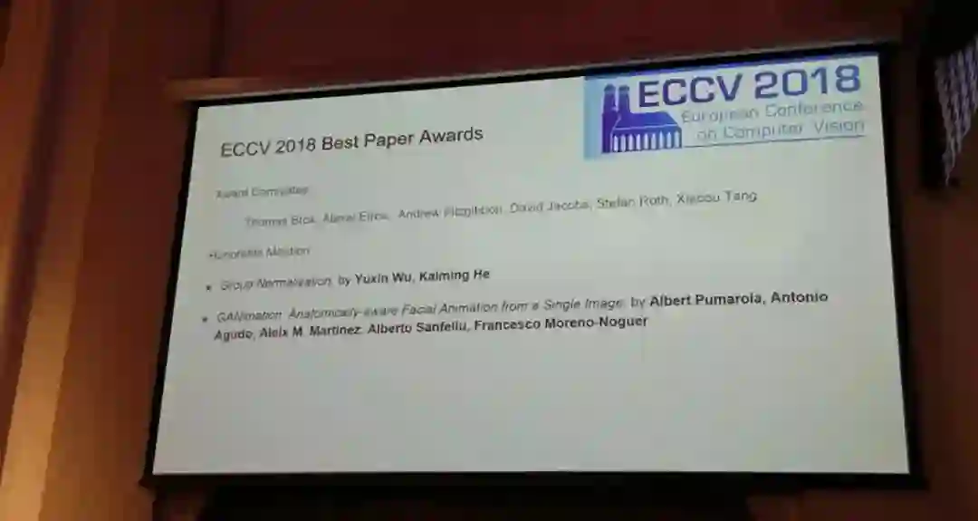 今日,ECCV 2018 获奖论文公布,来自德国航空航天中心、慕尼黑工业大学的研究者获得最佳论文奖项;吴育昕与何恺明合作的《Group Normalization》、Albert Pumarola 等人合作的《GANimation: Anatomically-aware Facial Animation from a Single Image》获得了最佳论文荣誉提名奖。