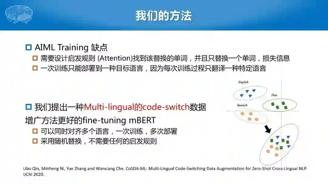 让我们理解下这种方法背后的直觉:最终训练的损失是一样的,但如果输入的语言不同,比如把“eat”换成“吃”,就隐含着学习了两者之间相似的表示,达到了一种跨语言的效果。实验结果显示在西班牙语、泰语等小数据语言上,比传统的方法有20~30个点的明显提升。