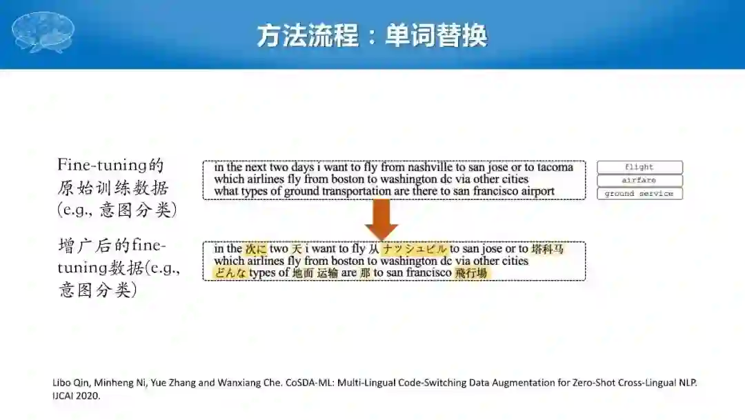 具体做法是从源语言的训练数据中选出一些句子,将句子中某些词语经过简单的词典替换成目标语言,但是目标语言是各种语言随机的替换,从而构成新的训练数据,用这个数据训练意图识别或者是自然语言理解的模型。这个模型训练好之后就可以直接应用于各种目标语言上。