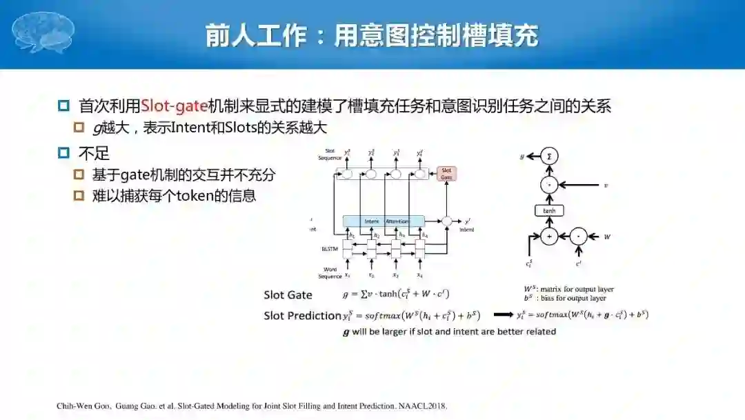 尽管前人有利用Slot-gate机制来显式地建模了槽填充任务和意图识别任务之间的关系,这种交互仍然不够充分,并且无法捕捉每个token上的具体信息,每个句子只有一个意图并进行槽的填充。