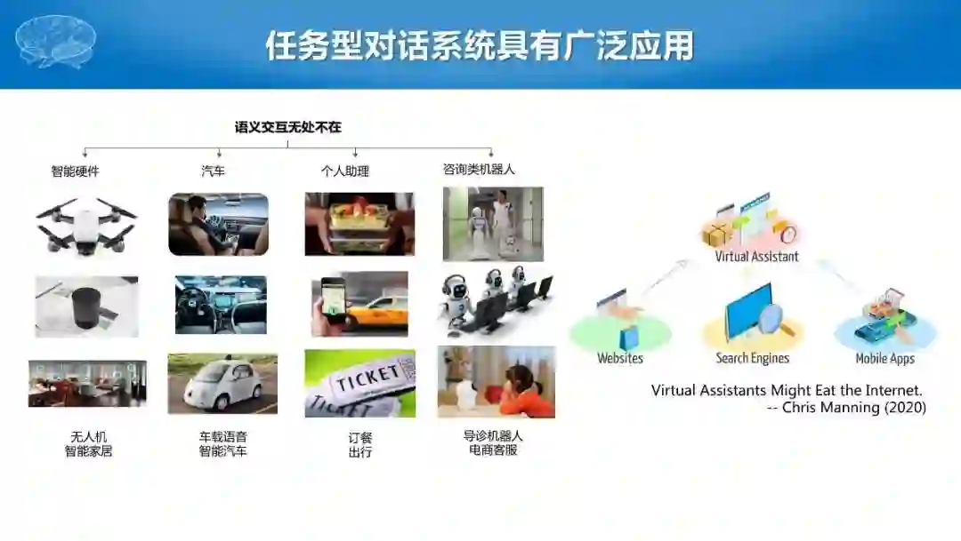 本次报告主要介绍任务型对话,即以任务或者动作为导向的对话系统。事实上,任务型对话技术在实际应用中几乎无处不在,从智能硬件、音箱、车载、个人助理到咨询类机器人等等。