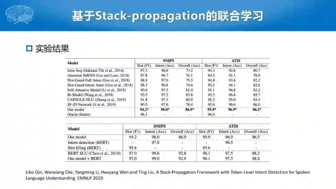 因此我们提出一种新的多任务学习框架Stack-propagation,改造了传统的多任务学习方法,即找到任务A的同时支撑任务B、使两者产生联系,把任务A的结果输入给任务B,从而完成更好的多任务学习的方式。