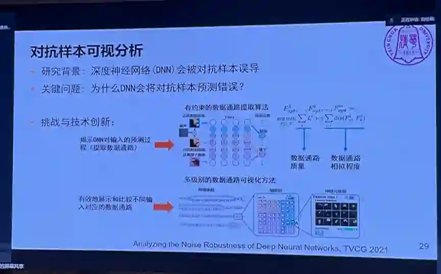 主持人为大会主席青海师范大学的耿生玲教授,报告人是清华大学的刘世霞教授。报告题目为《以数据为中心的可解释人工智能》,刘世霞教授提到在机器学习中,训练数据的质量决定了数据分析效果的上限,而模型和算法的改进只是不断逼近这个上限。目前可解释人工智能领域中数据存在的三个问题:数据标注错误、数据覆盖窄以及数据标注少。刘世霞教授基于上述三个问题展开报告,介绍了基于可视分析的数据质量可解释框架。该框架将机器学习方法和可视化技术紧密集成在一起,帮助数据专家更好地理解训练数据中的错误和不一致,提高数据的可用性。最后,结合具体的应用实例,如标注数据修正和数据集偏差消除等,介绍了基于该框架研制开发的可视分析方法与技术。