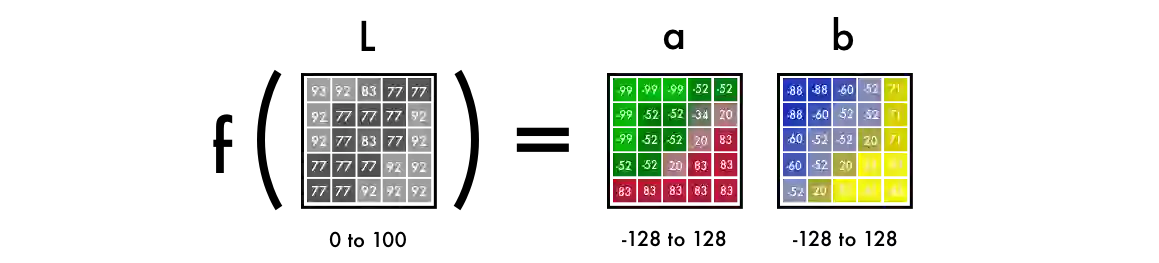 真实的颜色值分布在-128 到 128 的区间内。这是 Lab 色彩空间的默认区间。用 128 除这些值就能获得-1 到 1 的区间分布。这种「标准化」操作使我们能比较预测的误差。