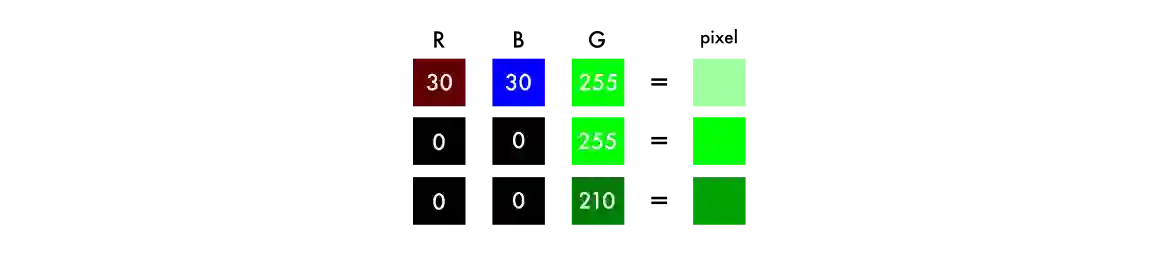 为了实现白色,你需要让三种颜色的分布平均,通过为红色和蓝色加入相同数值——结果就是绿色变得更亮了。所以,彩色图像使用三个通道的数值对比对颜色进行编码。