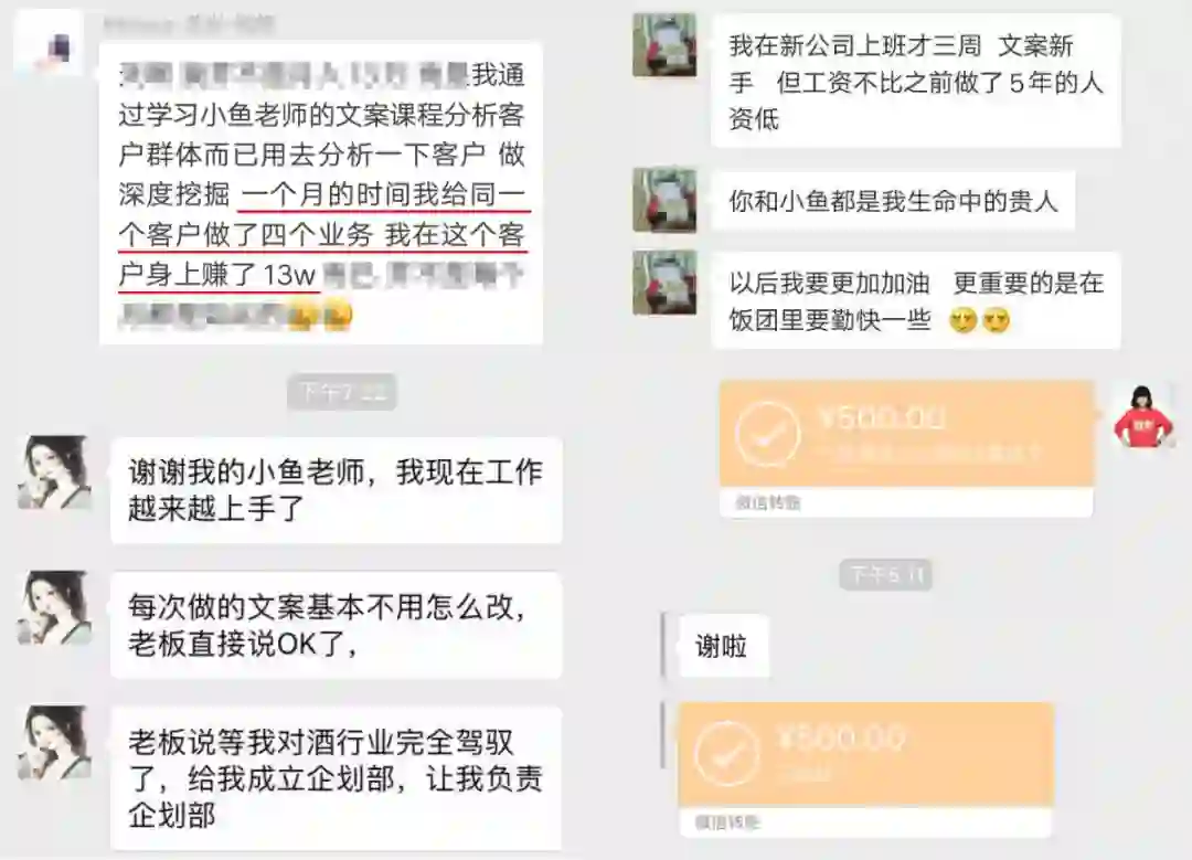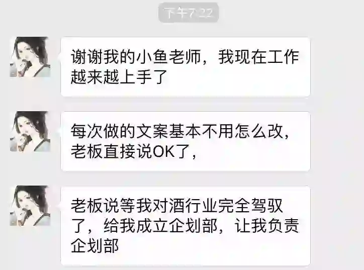 在小鱼老师的指导下,2000多位同学从0到1系统学习文案,通过文案底层逻辑框架和思维,有效提升了底层能力,遇见了更好的自己