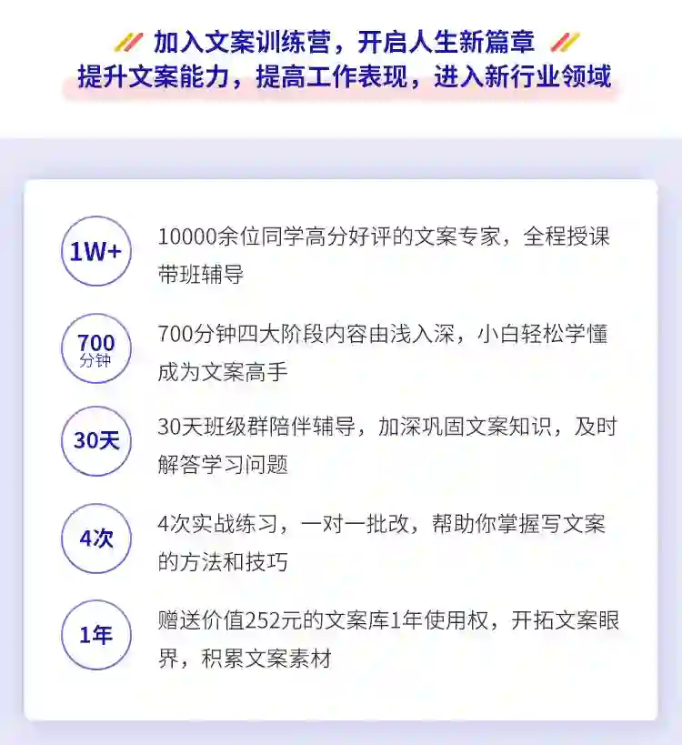 短句训练,让阅读体验更好;逻辑训练,让文案更清晰;生动训练,让用户欲罢不能;文案思维改简历,让HR过目不忘;文案思维做工作汇报,获得更多升职机会