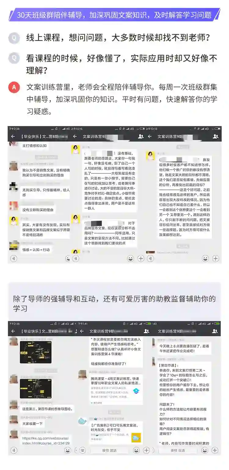 重视老师对同学们的日常辅导:每周三晚上8点,文案班老师都会在班级群里给大家复习、拓展课程知识。平时有问题,也可以随时请教到老师和助教。