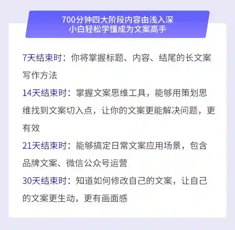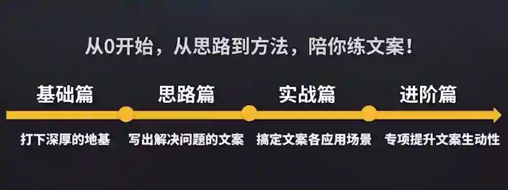 4个阶段学习,逐步带你从文案小白阶段的0分,成长为文案高手阶段的100分