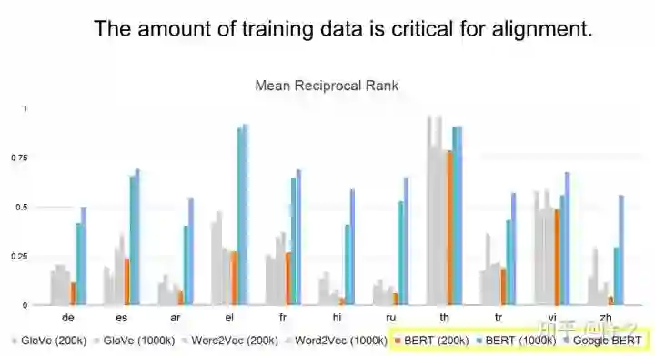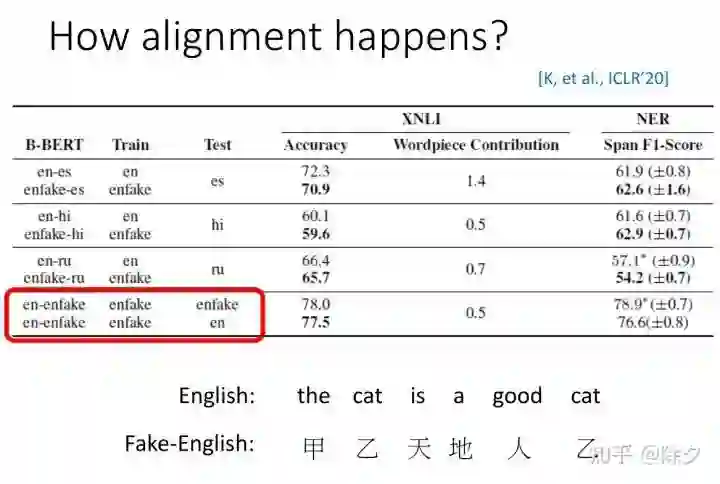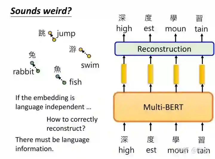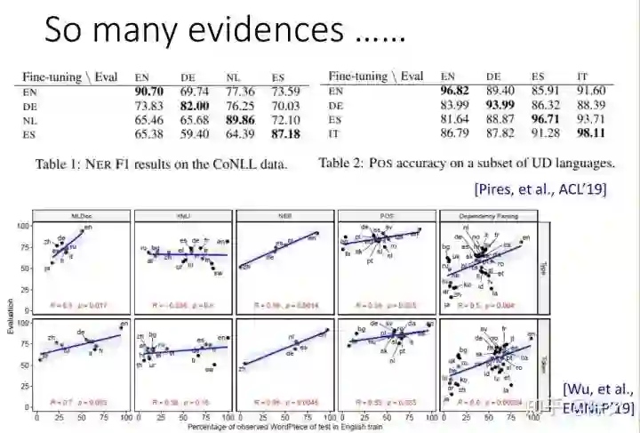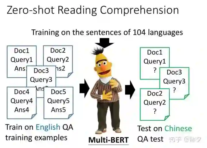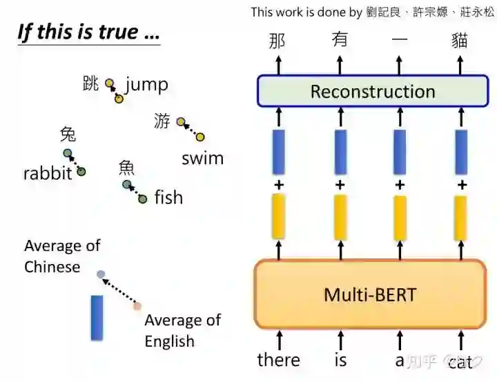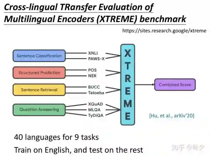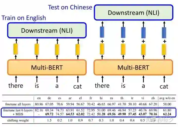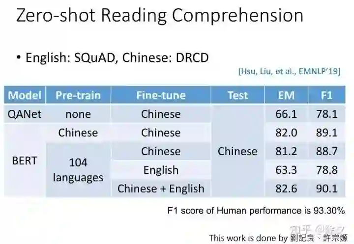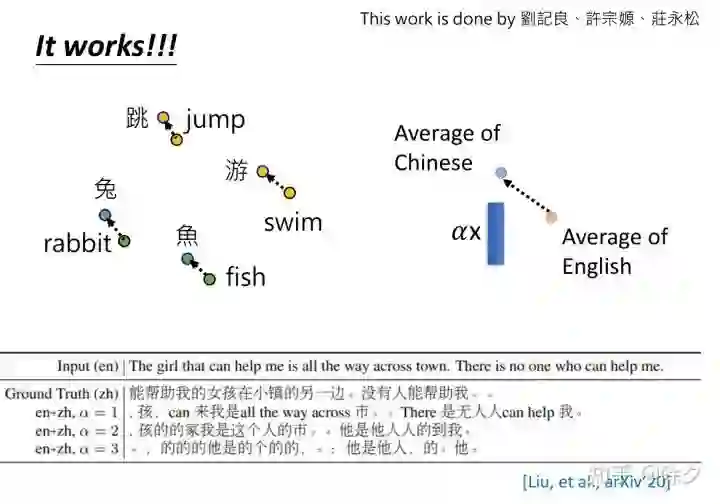 我们要把某一个模型训练到英文上,然后直接测试在其它语言上。MultiBERT 会把不同的语言对齐在一起。不同语言对于 MultiBERT 似乎是无差异的,所以它能在英文上微调,中文上测试。我们有没有办法可以把不同语言信息的差异从MultiBERT中抹除掉,这样跨语言的零样本学习的效果就会变得越来越好。我们可以做一个非常简单的尝试。我们先把MultiBERT在英文上微调,然后测试在中文上。不同的是,我们在输出的时候,再加上刚才那个平均语言差异向量。结果表明,在各式各样不同的语言上,得到的结果都有不同程度的微小提升。当然,目前用的抹掉语言差异的方法还很粗糙。未来可以研究出更好的技术。 视频见(需要梯子):https://www.youtube.com/watch?v=8rDN1jUI82g&feature=youtu.be Reference• [K, et al., ICLR’20] Karthikeyan K, Zihan Wang, Stephen Mayhew, and Dan Roth. Cross-lingual ability of multilingual BERT: An empirical study, ICLR, 2020• [Pires, et al., ACL’19] Telmo Pires, Eva Schlinger, Dan Garrette, How multilingual is Multilingual BERT?, ACL, 2019• [Wu, et al., EMNLP’19] Shijie Wu, Mark Dredze, Beto, Bentz, Becas: The Surprising Cross-Lingual Effectiveness of BERT, EMNLP, 2019• [Hsu, Liu, et al., EMNLP’19] Tsung-Yuan Hsu, Chi-Liang Liu and Hung-yi Lee, "Zero-shot Reading Comprehension by Cross-lingual Transfer Learning with Multi-lingual Language Representation Model", EMNLP, 2019• [Liu, et al., arXiv’20] Chi-Liang Liu, Tsung-Yuan Hsu, Yung-Sung Chuang, Hung-Yi Lee, A Study of Cross-Lingual Ability and Language-specific Information in Multilingual BERT, arXiv, 2020• [Hu, et al., arXiv’20] Junjie Hu, Sebastian Ruder, Aditya Siddhant, Graham Neubig, Orhan Firat, Melvin Johnson, XTREME: A Massively Multilingual Multi- task Benchmark for Evaluating Cross-lingual Generalization, arXiv, 2020• [Libovický, arXiv’20] Jindřich Libovický, Rudolf Rosa, Alexander Fraser, On the Language Neutrality of Pre-trained Multilingual Representations, arXiv, 2020
