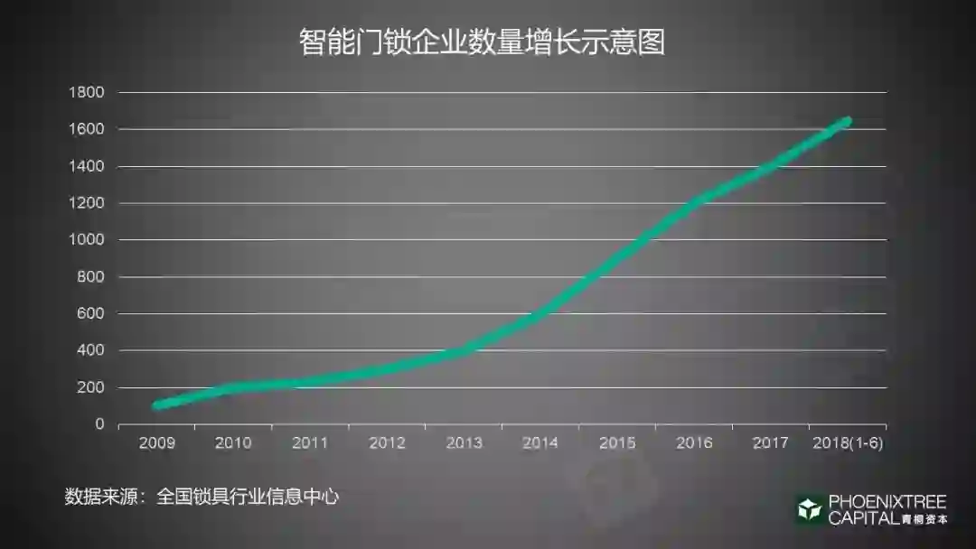 智能门锁从2015年步入发展的快车道,市场总销量以每年平均近100%的速度在增长,到2018年家庭端销量突破1000万套,有1500多家企业进入智能门锁领域,这个行业正快速走向繁荣期。