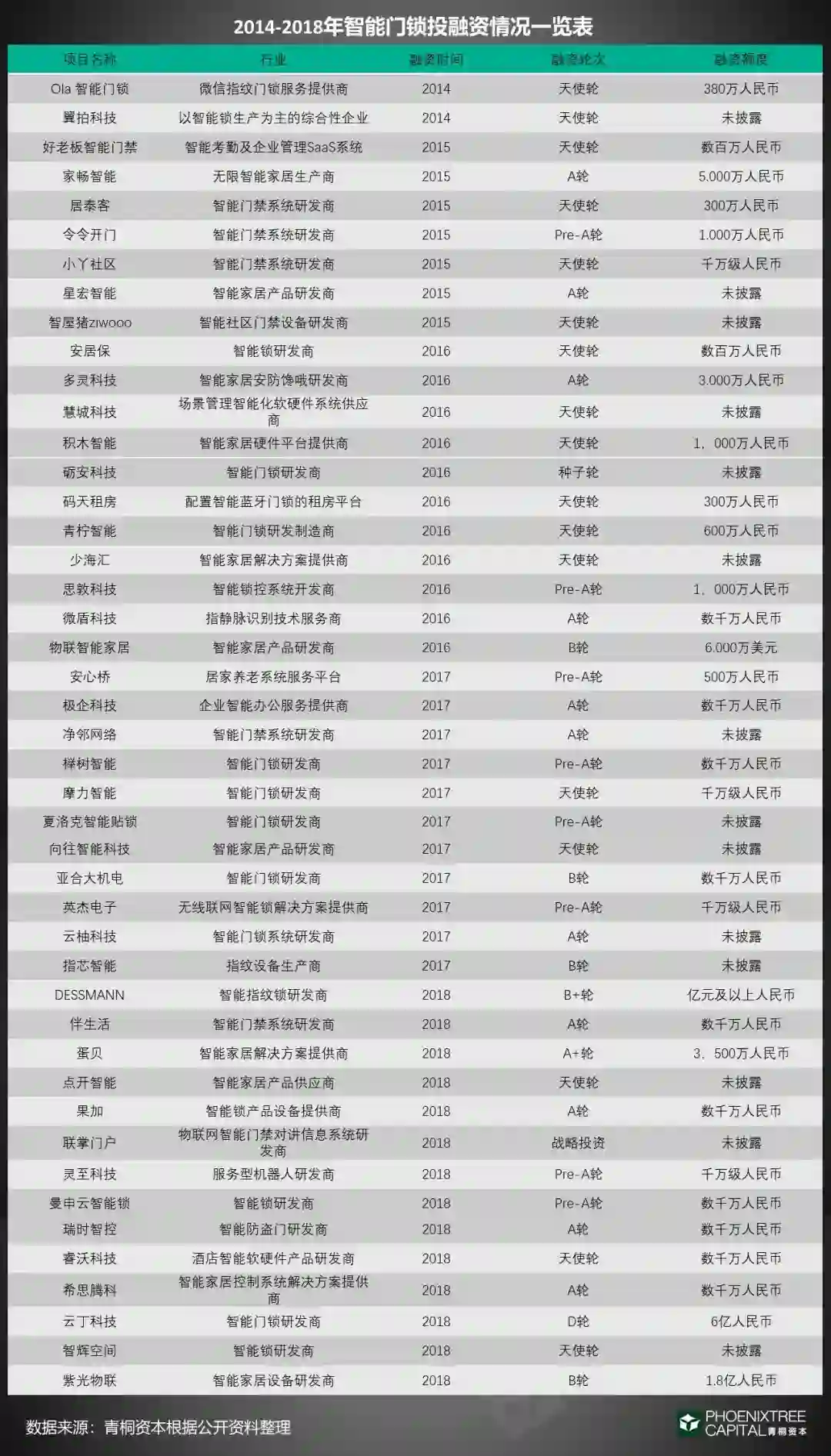 智能门锁发展的繁荣景象,从市场投融资维度也得到论证。青桐资本统计了2014年-2018年智能门锁厂商获得的45起融资数据。