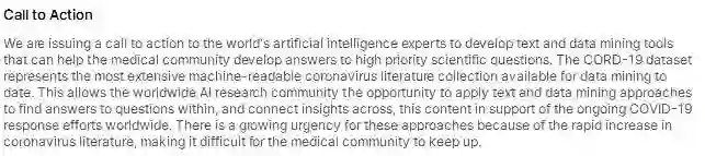 "我们正在向全球的人工智能专家发出开发文本和数据挖掘工具的号召,以此帮助医学界为一些高度优先级的科学问题找到答案,CORD-19数据集代表了迄今为止可用于数据挖掘的最广泛的机器可读冠状病毒文献集,这使全球AI研究社区有机会应用文本和数据挖掘方法来查找问题答案,并在各部分内容间形成见解,以此来支持全球正在进行的CORD-19相应工作。数据挖掘工具需求紧迫,因为日益增加的冠状病毒研究成果让医学界难以应对。"