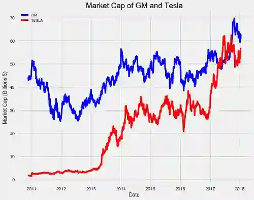 市值的单位为十亿美元。我们可以看到,开始时通用汽车的市场份额超过特斯拉 30 倍。随着时间推移,事情会保持不变吗?