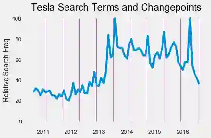 我们也可以观察由模型确定的变化点。变化点代表时间序列从上升到下降(或相反)的趋势。为了便于比较,我们可以在此时间范围内查看特斯拉的谷歌搜索趋势,看看这些变化是否一致。我们在一张图上同时画出变化点(垂直线)和搜索趋势: