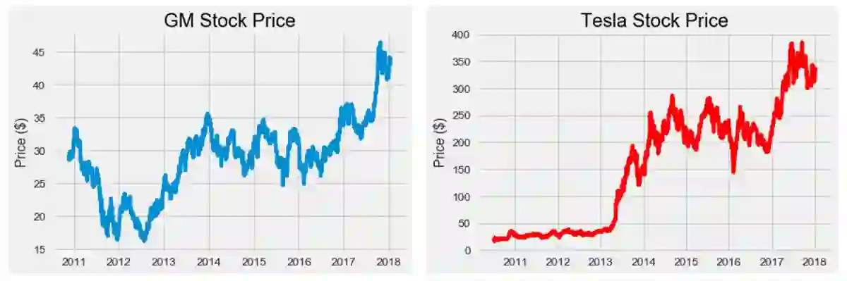 首先,引入所需的库并获取数据。Quandl 中的数据几乎是无限的,但我想集中比较同行业中的两家公司,即特斯拉和通用汽车。特斯拉是一个引人注目的公司,不仅因为它是 111 年以来美国第一个成功的汽车创业公司,它也是 2017 年美国最值钱的汽车公司。它的竞争者是通用汽车,通用汽车最近已经通过制造一些非常酷的全电动车来展现拥抱未来汽车的迹象。