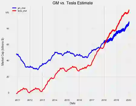 我们的模型认为,特斯拉在 2017 年短暂超越通用汽车的事件只是噪音,在预测中,特斯拉到 2018 年初之后才会超越通用汽车。确切的日期是 2018 年 1 月 27 日,所以如果这个事件发生了,我将准确地预测了未来!