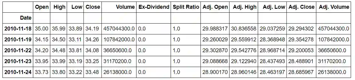 Quandly 自动将数据放入 Pandas 数据框(DataFrame)中,DataFrame 是数据科学家的首选数据类型。(对于其他公司,只需用「TSLA」或「GM」替换股票代码,你也可以指定日期范围)