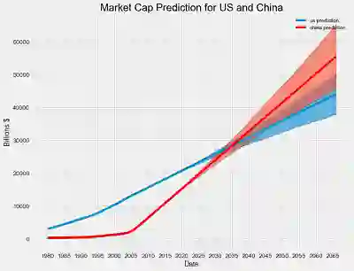 Prophet 也可以应用于更大规模的数据测量,如国内生产总值(衡量一个国家经济总体规模)。我根据美国和中国的历史 GDP 创建了 prophet 模型并做了以下预测。