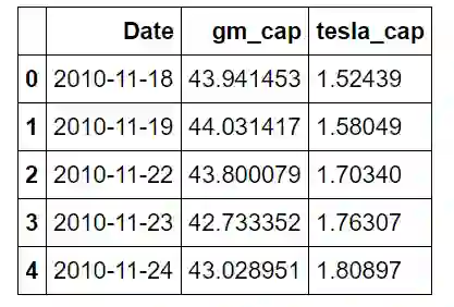 这为特斯拉创建了名为「cap」的列。我们对通用汽车数据进行同样的处理,然后将两者关联(merge)。关联实质上是数据科学工作流的一部分,因为它允许我们在共享列的基础上合并不同的数据集。在这种情况下,该列是日期。我们进行「inner」关联,只保存两个数据框中有相同日期的数据行。