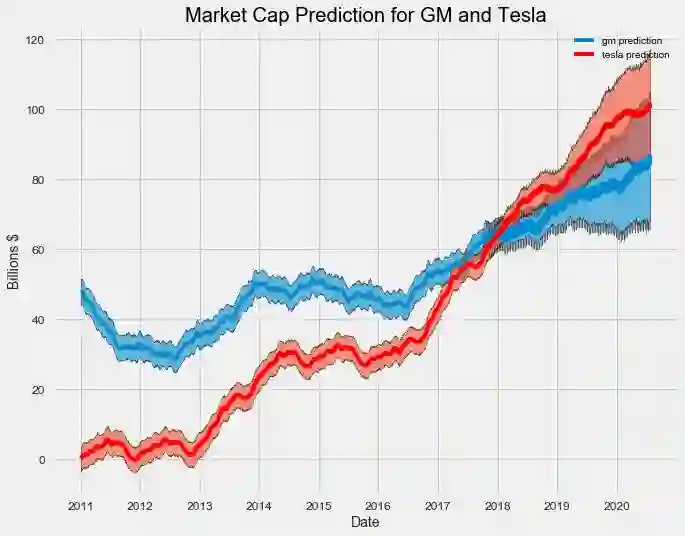 在此期间,特斯拉销售约 4.8 万辆汽车,而通用汽车售出 150 万辆。即使销售了 30 多倍汽车,通用汽车的价值仍低于特斯拉。这绝对显示了有号召力的执行官和高质量的产品(如果极低产量)的力量。尽管特斯拉的价值现在低于通用汽车,但是一个好问题可能是,我们可以预测特斯拉再次超越通用汽车吗?什么时候会发生?为此,我们转向预测加法模型,预测未来。