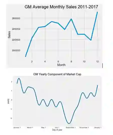 这个趋势非常明显:通用汽车的股价正在上涨并将继续上涨。年度模式很有意思,因为这似乎揭示了通用汽车的股价在年底会有所增长,但随后会缓慢下滑直到夏季。因此,我们可以尝试计算年度市值与通用汽车在此期间平均每月的销售额之间是否存在相关关系。
