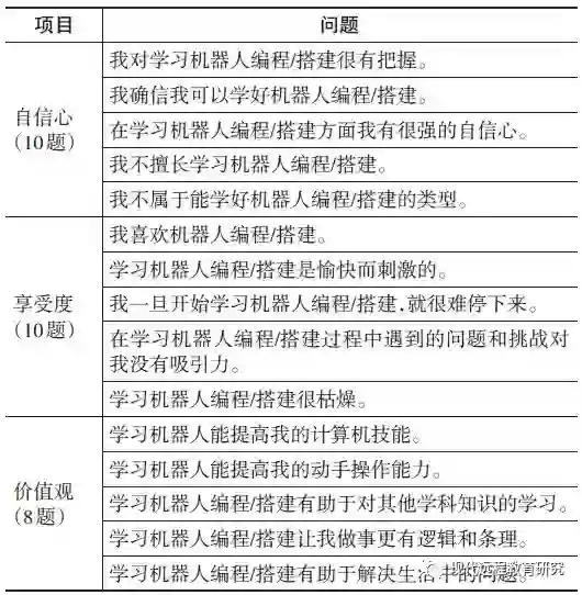 学习态度问卷用来调查学生接受一学期的机器人课程学习之后对机器人搭建和机器人编程的自信心、享受度以及价值观上的认可度。问卷采用的是5点李克特量表,即答案范围从非常同意到非常不同意分为5个水平。学习态度问卷中自信心、享受度和价值观三维度问题的划分见表4,量表来源和信度详见表5。