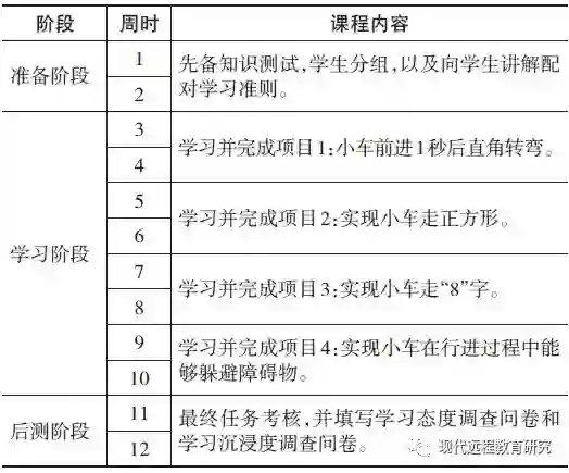 教学实验一共持续12周。其中前两周进行先备知识测试以及学生分组;第3~10周学习机器人课程知识,并完成4个项目;第11~12周进行任务考核,以及态度问卷调查和学习沉浸度问卷调查,任务考核和问卷填写要求每个学生独立完成。具体课时安排见表2。