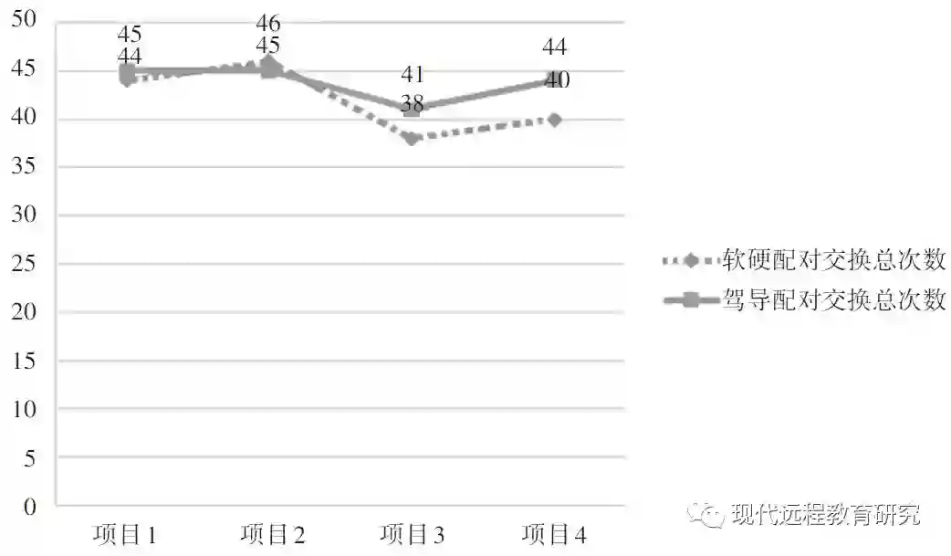 其次,本研究根据机器人教育的特点构建了软硬配对模式,与沿袭配对编程的驾导配对模式相比是否更加适合机器人教育?只通过上述问题还无法得到全面的答案,学生在完成项目过程中,其互动行为是否有差异,将是体现深度合作学习的一个重要方面。从配对学习的角度而言,同伴之间角色交换频率的差异可以作为一个衡量指标。因此,本研究除了关注两种配对学习模式在以上三方面的差异外,还将回答以下一个问题:在学习过程中,两种配对学习模式下学生的角色交换频率是否有差异?