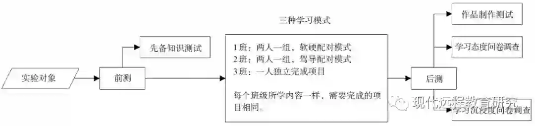 为探索配对学习模式在小学机器人教育中的有效性,本研究设定教学干预措施——学习模式为自变量,作品制作质量、学习态度、学习沉浸度为因变量,分别经由作品制作测试、学习态度问卷调查、学习沉浸度问卷调查获得分数,如图3所示。