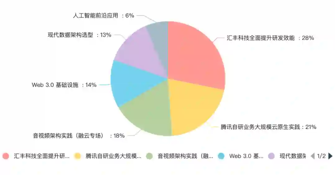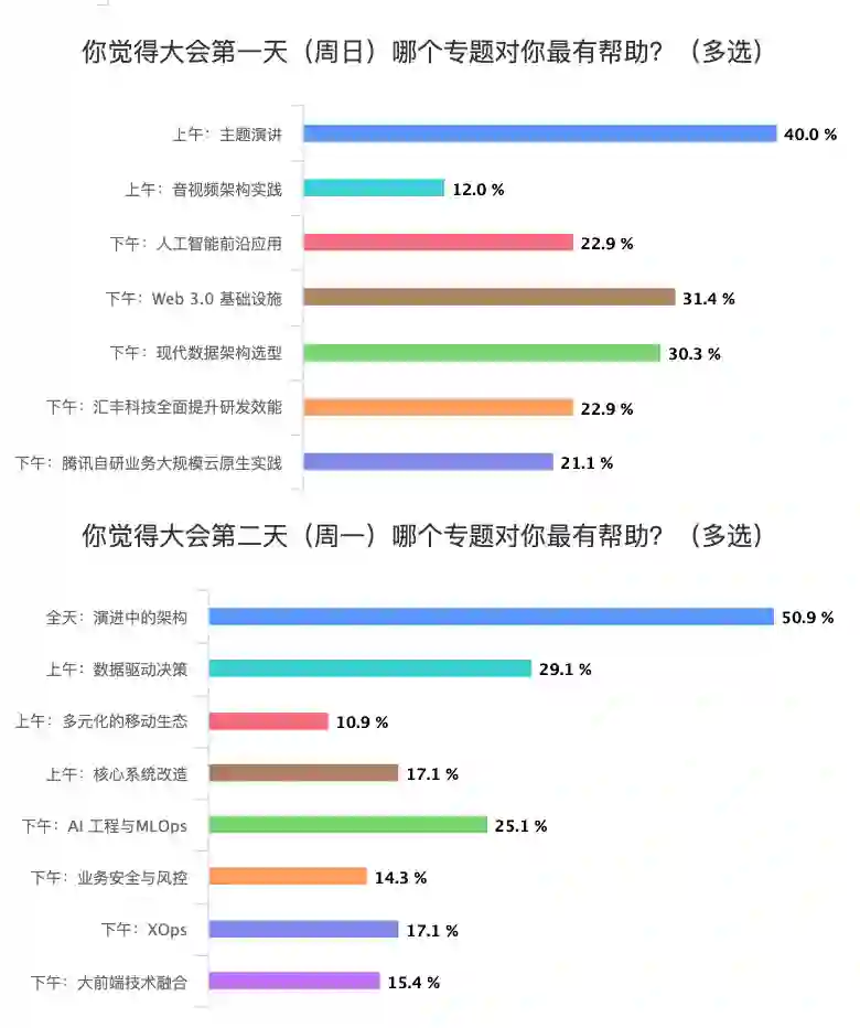 在大会结束当日下午,大会邀请参会者参与了有奖调研,回收近 200 份问卷。结果显示,大会第一天的「主题演讲」「Web 3.0 基础设施」「现代数据架构选型」以及大会第二天的「演进中的架构」「数据驱动决策」「AI 工程与 MLOps」位列最受参会者喜爱的专题 Top 3(注:投票结果受参会者本人所在领域影响,数据仅作参考)。