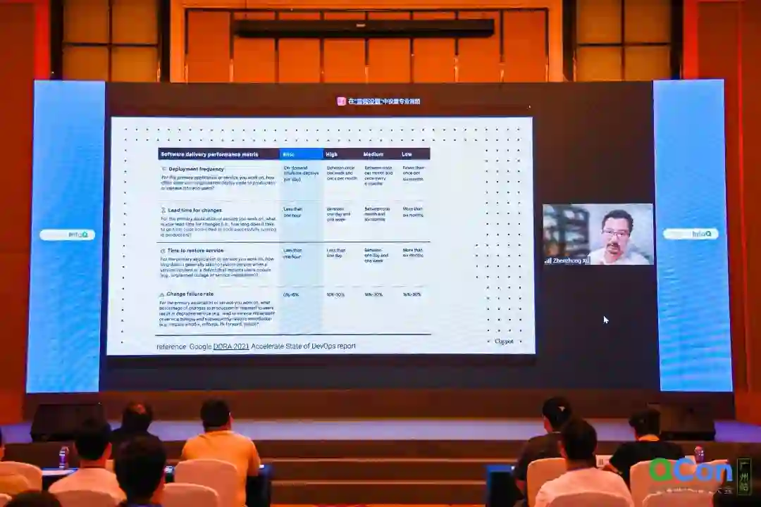 本届大会还邀请到南京大学教授、博士生导师,南京大学软件研发效能实验室主任张贺博士参与主题演讲,虽然因为一些不可抗力,张教授无法来到现场,但他通过远程的方式为现场听众剖析了云原生时代的软件工程的本质。张教授提出: