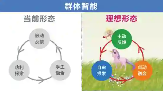 当前形态是什么呢?探索在某种意义上有些功利性,融合是手工,反馈是被动的。如果我们自由探索,把融合变成自动的,然后根据个体能力和特性,进行有针对性的反馈,这样一来效率就更高。