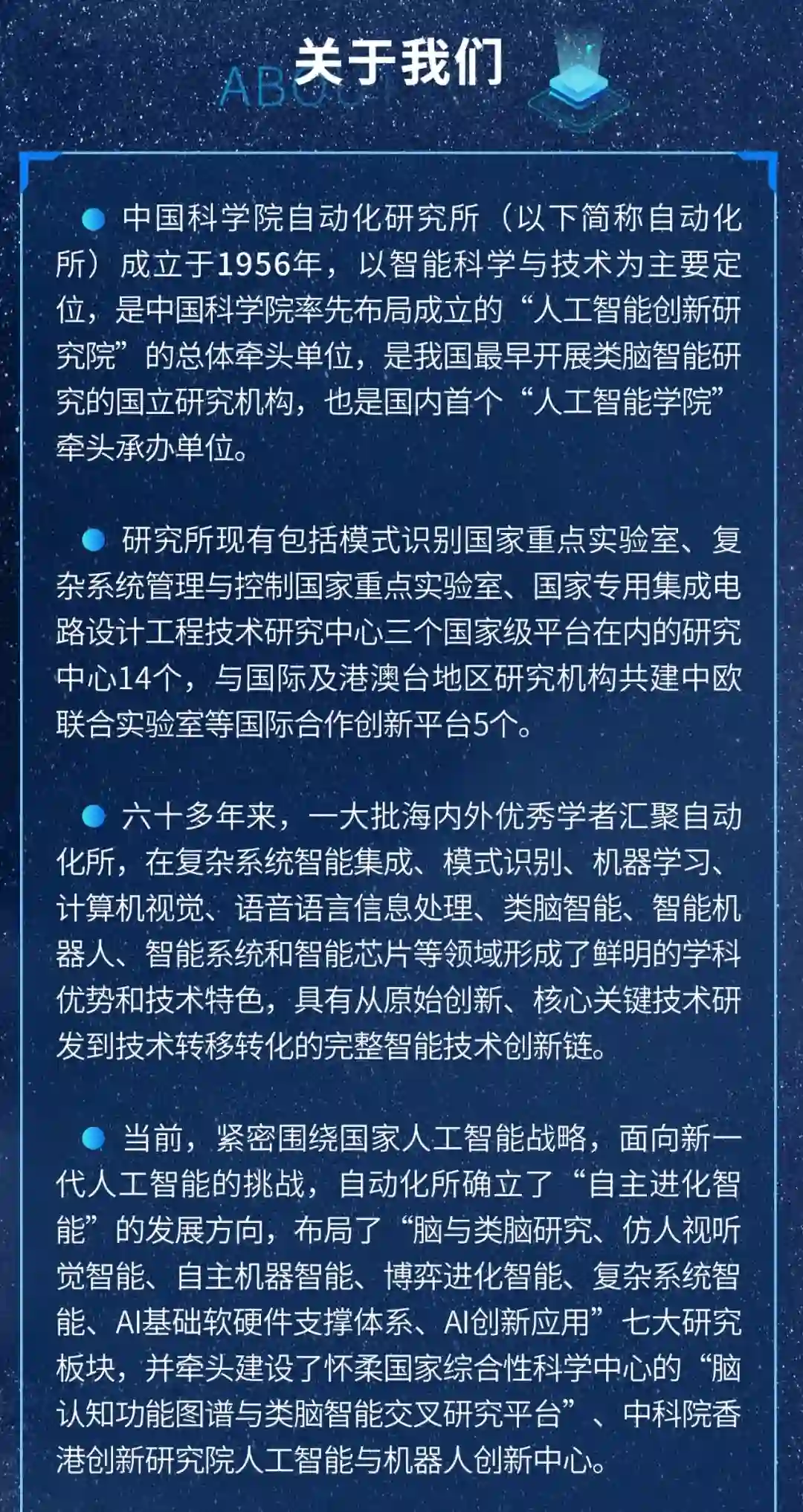 中国科学院自动化研究所(以下简称自动化所)成立于1956年10月,是我国最早成立的国立自动化研究机构和最早开展类脑智能研究的国立研究机构。自动化所同时是中国科学院率先布局成立的“人工智能创新研究院”的总体牵头单位,“脑科学与智能技术卓越创新中心”的依托单位之一,也是国内外首个“人工智能学院”牵头承办单位,具有从智能机理、智能芯片、智能算法到智能系统完整的学科分布和优势领域。